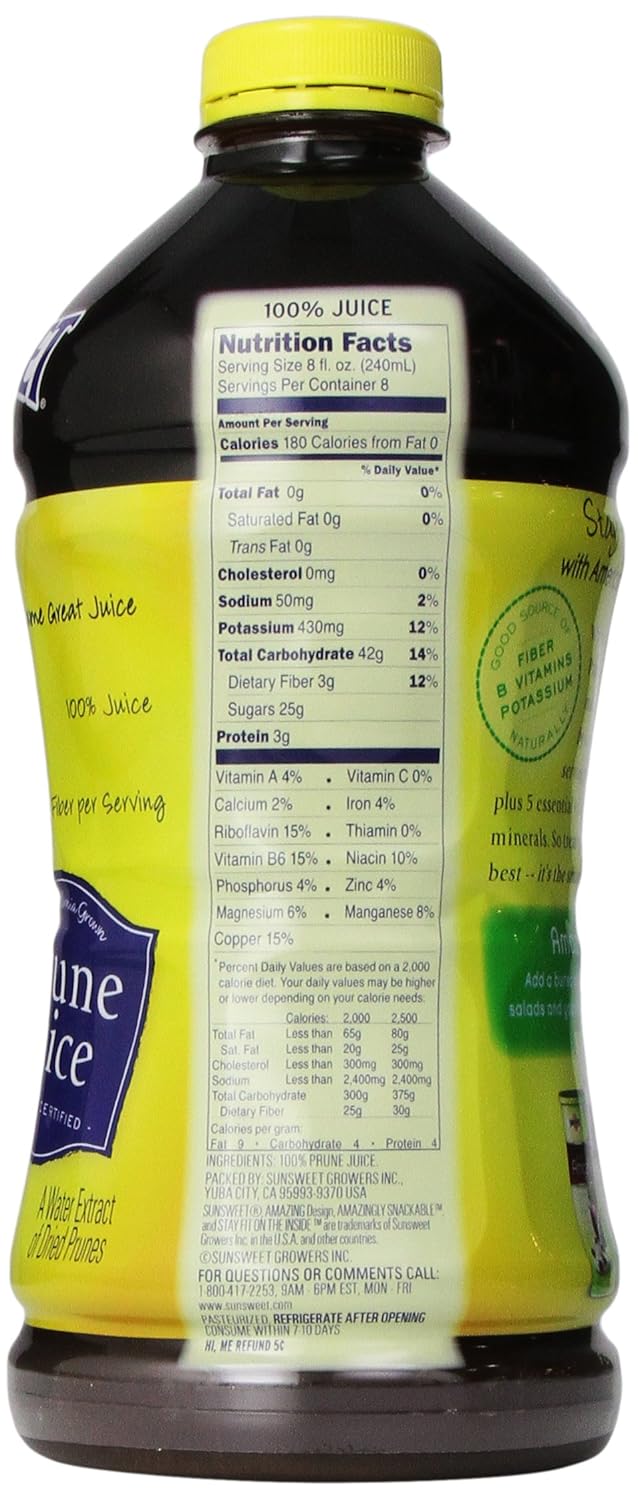 Prune Juice Nutrition Label - This Nutrition Learn more information about prune juice nutrition label. In this article we'll discuss prune juice nutrition label. ThisNutrition. Search; Articles Quizzes Sign In; Register; Home; Articles; Prune Juice Nutrition Label; Prune Juice Nutrition Label Published on: 25/12/2020 | Last Updated: 07/04/2021 Prune juice by CALIFORNIA GOLD nutrition facts and analysis. Prune juice by CALIFORNIA GOLD contains 180 calories per 240 g serving. This serving contains 0 g of fat, 3 g of protein and 42 g of carbohydrate. The latter is 25 g sugar and 2.9 g of dietary fiber, the rest is complex carbohydrate. ... Nutrition labels presented on this site is for illustration purposes only. Food images may show a similar or ... Prune Juice Organic(946ml Brand Nutrition Facts & Calories Prune Juice Organic (946ml Brand LOG KEY FACTS (learn about health benefits or risks) Has low calorie density - this means that the amount of calories you are getting from an ounce is low (0 cal/oz). Does not contain any risky components such as sodium, cholesterol, saturated fat and added sugar! This item has no fiber content (0% of DV/100g). › health › food-nutritionPrunes and Prune Juice: Health Benefits and Nutrition Nov 01, 2018 · Prunes can help you manage your weight. They do this by keeping you feeling full for longer. The reason for this is likely twofold. First, prunes contain lots of fiber, which is slow to digest ...