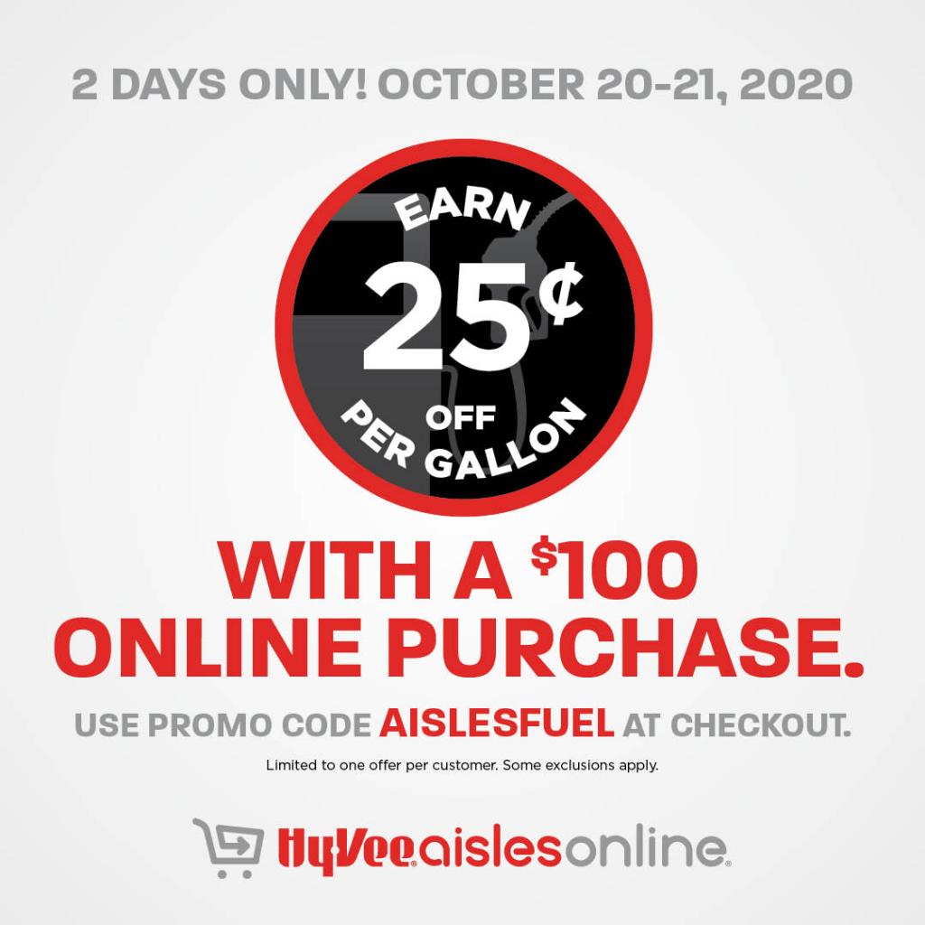 Hy-Vee Coupon, Promo Codes: $5 Off - July 2022 $0.75 Off Per Gallon With $100 Online Order Show Coupon Code See Details 20% OFF Code 20% Off Orders of $30 Or More Show Coupon Code See Details 10% OFF Sale 10% Off Your Meat, Seafood & Deli Purchases See Details PROMO CODE Code Fuel Saver! $0.15 Off Per Gallon With a $125 Online Purchase Added by Stde Show Coupon Code See Details UP TO $1 OFF