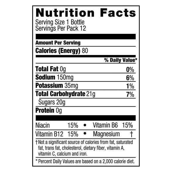 Mountain Berry Blast Sports Drink - Nutrition Facts Powerade. Mountain Berry Blast Sports Drink. Nutrition Facts ... The % Daily Value (DV) tells you how much a nutrient in a serving of food contributes to a ... Powerade Nutrition Facts - Eat This Much Powerade Sports drink, lemon-lime flavored, ready-to-drink Find on Amazon Percent calories from... Quick stats 116.8 Calories 28.6g Carbs (28.6g net carbs) 0.2g Fat 0g Protein No price info Try our free Diet Generator I want to eat calories in meals. I like to eat Powerade Ingredients | All You Need To Know The Powerade ingredients are: Water High Fructose corn syrup Salt Potassium Citrate Phenylalanine Sucrose Sodium citrate Malic acid Potassium phosphate Vitamin B6 Vitamin B2 Sugar Water is essential to quench your thirst and regain energy, it works as a charger for your body. Powerade Nutrition Label | Besto Blog Powerade Zero Nutrition Label Food City Powerade Zero Calorie Sports Drink Powerade Vs Gatorade [irp] Powerade White Cherry Sports Drink 32 Oz Plastic Bottles Pack Of 15 Gatorade or powerade the online synchro coach powerade nutrition facts label pensandpieces powerade label nutrition facts powerade zero keto count health first