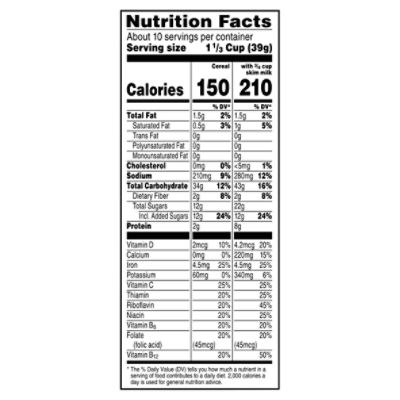 Kellogg's Fruit Loops Cereal Family Size Nutrition Facts Rich in vitamins and minerals (30.3%/cal) - a good source of Iron, Manganese, Vitamin B12, Vitamin D, Vitamin B6, Zinc, Magnesium, Copper, Phosphorus and Potassium. Contains a high amount of risky components that may include sodium and sugars (0.03%/oz). Good source of proteins (18% of DV/100g). Good source of fiber (51% of DV/100g).