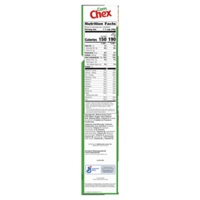 Corn Chex Cereal: Calories, Nutrition Analysis & More | Fooducate Nutrition Serving Size: 1 cup (33 g) Amount per Serving My Daily Value Calories 120 Kcal 7% Total Fat 0.5 g 1% Saturated Fat 0 g 0% Trans Fat 0 g 0% Cholesterol 0 mg 0% Sodium 290 mg 13% Total Carbohydrate 26 g 11% Dietary Fiber 1 g 4% Sugars 3 g 4% Added Sugars 3 g 12% Protein 2 g 4% Vitamin A 150 mcg 21% Vitamin C 6 mg 8% Calcium 100 mg 10%