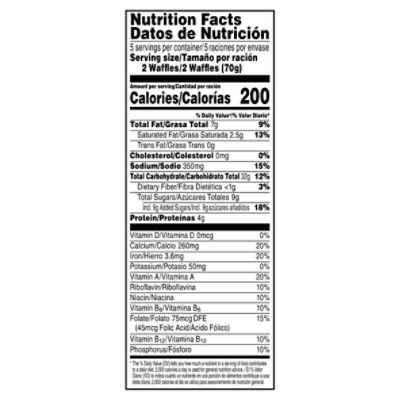 EWG's Food Scores | Eggo Eggo Buttermilk Waffles, Buttermilk Check out the food score for Eggo Eggo Buttermilk Waffles, Buttermilk from EWG's Food Scores! EWG's Food Scores rates more than 80,000 foods in a simple, searchable online format to empower you to shop smarter and eat healthier. ... Label for Eggo Eggo Buttermilk Waffles, Buttermilk captured by LabelINSIGHT on Mar 15, 2022 Tell us if the ... Eggo* Thick & Fluffy Belgian Waffles Original - SmartLabel™ Eggo* Eggo* Thick & Fluffy Belgian Waffles Original. 330 g. 00064100107649. Nutrition . Ingredients . Allergens . Features & Benefits . Company, Brand & Sustainability . 160. Calories. 2 g. Saturated Fat. 250 mg. Sodium. 3 g. Sugar. Nutrition Facts. Per 1 waffle (55 g) Amount Per Serving; Calories 160 : Amount/Serving % Daily Value* Total Fat 8 ... Eggo* Original Waffles - SmartLabel™ - Kellogg's Kellogg's* Eggo* waffles or pancakes Eggo* Original Waffles. 280 g. 00064100239623. Nutrition . Ingredients . Allergens . Features & ... & Sustainability . 180. Calories. 1.5 g. Saturated Fat. 300 mg. Sodium. 4 g. Sugar. Nutrition Facts. Per 2 waffles (70 g) Amount Per Serving; Calories 180 : Amount/Serving % Daily Value* Total Fat 5 g: 7 % ... PDF Kellogg Eggo Waffles Homestyle 1.23oz 144ct The actual nutritional label(s) on the package may vary slightly Nutrition Facts (Unprepared) Serving Size 70 g Amount Per Serving Calories 180 Calories from fat 50 % Daily Value* Total Fat 6 g 9% Saturated Fat 1.5 g 8% Trans Fat 0 g