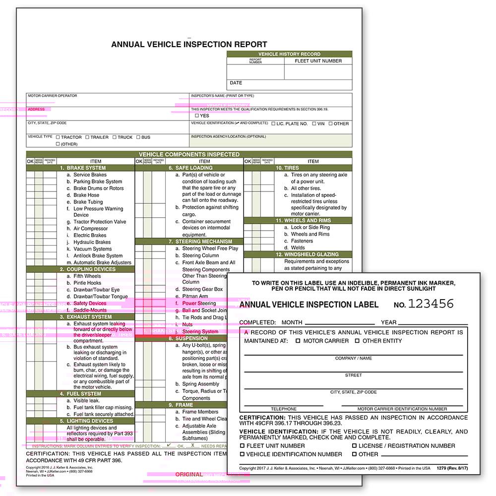 Annual Vehicle Inspection Report/Label: With Carbon, 3 Plies Product Description. Use the J.J. Keller annual vehicle inspection report and label to help meet DOT's annual vehicle inspection requirements under Part 396.21. The 8-1/2" x 11-3/4" inspection form also includes Minimum Periodic Inspection Standards (Part 396, Appendix G to Subchapter B) on back of form to reinforce the vehicle inspection ...