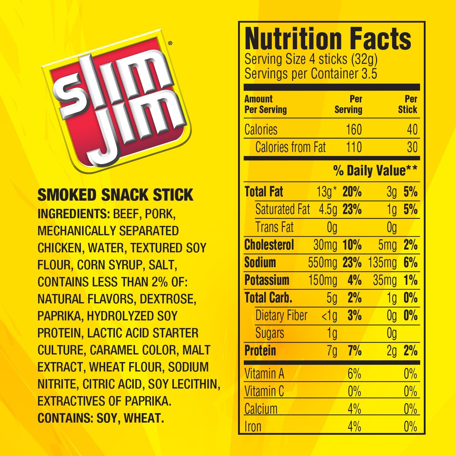 Small slim jim nutrition facts. Slim Jim Beef Jerky, Tabasco Nutrition Facts - GroceryNutrition.org Slim Jim Beef Jerky, Tabasco Ingredients. Slim Jim Beef Jerky, Tabasco contains the following ingredients: Beef, water, sugar, tabasco brand pepper paste (distilled vinegar, red pepper, salt), less than 2% of: salt, brown sugar, flavorings, tabasco brand crushed pepper (red pepper, distilled vinegar, salt), vinegar, maltodextrin, sodium nitrite. Slim Jim Nutritional Information | Healthfully With a 2,000-calorie diet, you should get between 225 and 325 g of carbohydrates each day, preferably from whole grains, fruits and beans. Slim Jims offer 7 g of carbohydrates, with 0 g of dietary fiber and 2 g of sugar-based carbs. Protein Slim Jims contain 10 g of protein per stick. Slim Jim mini sticks Nutrition Facts & Calories - Inlivo Good source of proteins (44% of DV/100g). Good source of fiber (13% of DV/100g). Relatively high in saturated fat (70% of DV/100g). Calories in 1 4 Sticks (1.1 oz) 160 calories / 117 from fat Carbohydrates 5 g Proteins 7 g Fat 13 g Saturated Fat 4.5 g Calories Nutrition Risky Content High Density (5 cal/g) Medium Density (2.6 %/cal) Slim Jim Original Nutrition Facts & Calories - Inlivo Good source of proteins (50% of DV/100g). Relatively high in saturated fat (63% of DV/100g). This item has no fiber content (0% of DV/100g). Calories in 1 1 Stick (0.3 oz) 40 calories / 27 from fat Carbohydrates 1 g Proteins 2 g Fat 3 g Saturated Fat 1 g Calories Nutrition Risky Content High Density (5 cal/g) High Density (7 %/cal)