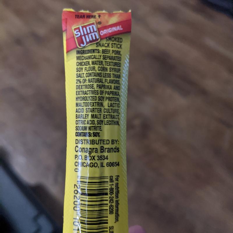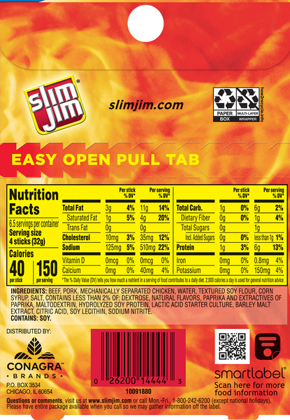 SLIM JIM ORIGINAL STICK 0.44 OZ | Conagra Foodservice These meaty snack sticks are made with no artificial flavors, no artificial colors and a combination of beef, pork and chicken. Snap into a Slim Jim and snack like the beefy boss you know you are. * 2 g protein, 2 g net carbs (2 g total carbohydrates minus 0 g dietary fiber) and 0 g added sugar per 0.44 oz. stick Measure Packaging Size: