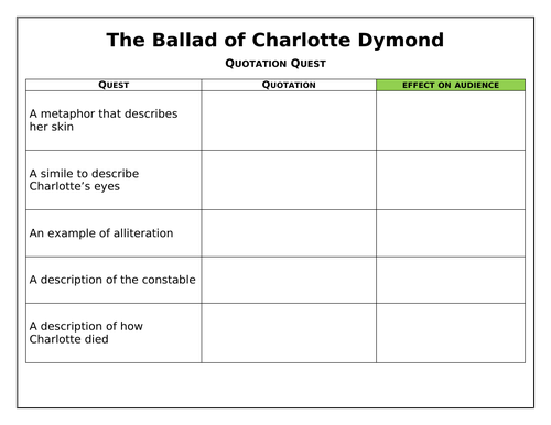 Ballads | Lesson Plan Ballad of Charlotte Dymond including writing and speaking and listening. Get your students to interact with the poem and their learning by acting out the trial of Matthew Weeks. ... CHARLOTTE_DIAMOND_2.pptx Activity . February 10, 2020 . 0.1 MB . InformationforTrial.doc Handout . February 10, 2020 . 0.1 MB ...