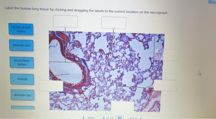 Labeled Diagram of the Human Lungs - Bodytomy Given below is a labeled diagram of the human lungs followed by a brief account of the different parts of the lungs and their functions. Each lung is enclosed inside a sac called pleura, which is a double-membrane structure formed by a smooth membrane called serous membrane. Solved Label the photomicrogram of the lung Alveolar duct - Chegg Expert Answer 100% (1 rating) A.Alveolar duct. B.SMALL BRANCH OF PULMONARY A … View the full answer Transcribed image text: Label the photomicrogram of the lung Alveolar duct Alveolus Small branch of pulmonary a. bronchiole Alveolar sac Reset Zoom < Prev 22 of 40::: Next > 20 Previous question Next question