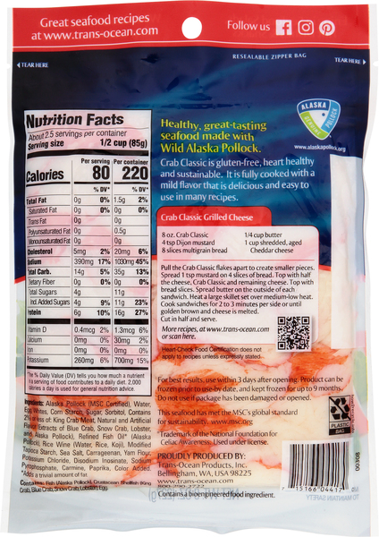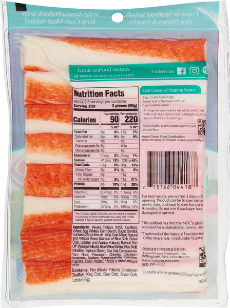 Crab: Is It Good for You? Pros and Cons, Nutrition Information ... - WebMD Crab is rich in: Vitamin B12 Folate Iron Niacin Selenium Zinc A 1-cup serving of cooked crab contains: 173 calories 24 grams of protein Less than 1 gram of fat 0 grams of carbohydrates 0... Imitation Crab Nutrition Facts - Eat This Much Crab Stick. Nutrition Facts. For a Serving Size of 1 serving. How many calories are in Imitation Crab? Amount of calories in Imitation Crab: Calories 81. Calories from Fat 3.6 ( 4.4 %) % Daily Value *. Is Imitation Crab Meat Healthy for You - SFGATE A 3-ounce serving of imitation crab meat contains 81 calories and less than 1 gram of fat. The same serving of imitation crab provides 17 milligrams of cholesterol, making it a useful option... Imitation Crab Meat (Should You Add It to a Menu?) A 3-ounce portion of imitation crab has roughly 83 calories, 6 grams of protein, and 13 grams of carbohydrates, 5 of which are from the sugar ingredient. The exact amount of real king crab contains the same number of calories but 16 grams of protein (10 more grams) and no carbohydrates.