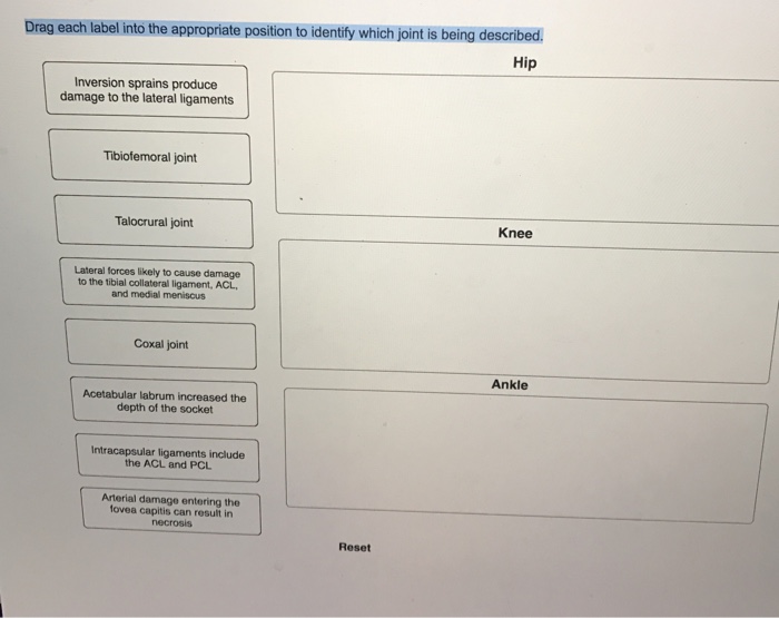 lecture 5 homework BIOL 203 Flashcards | Quizlet Drag each label into the appropriate position to identify the degrees of freedom for each joint. -MOVEMENT IN 3 PLANES -ball- and socket -hip joint - glenohumeral joint Complete each sentence by dragging the proper word or phrase into the appropriate position to describe the typical anatomy of a synovial joint.